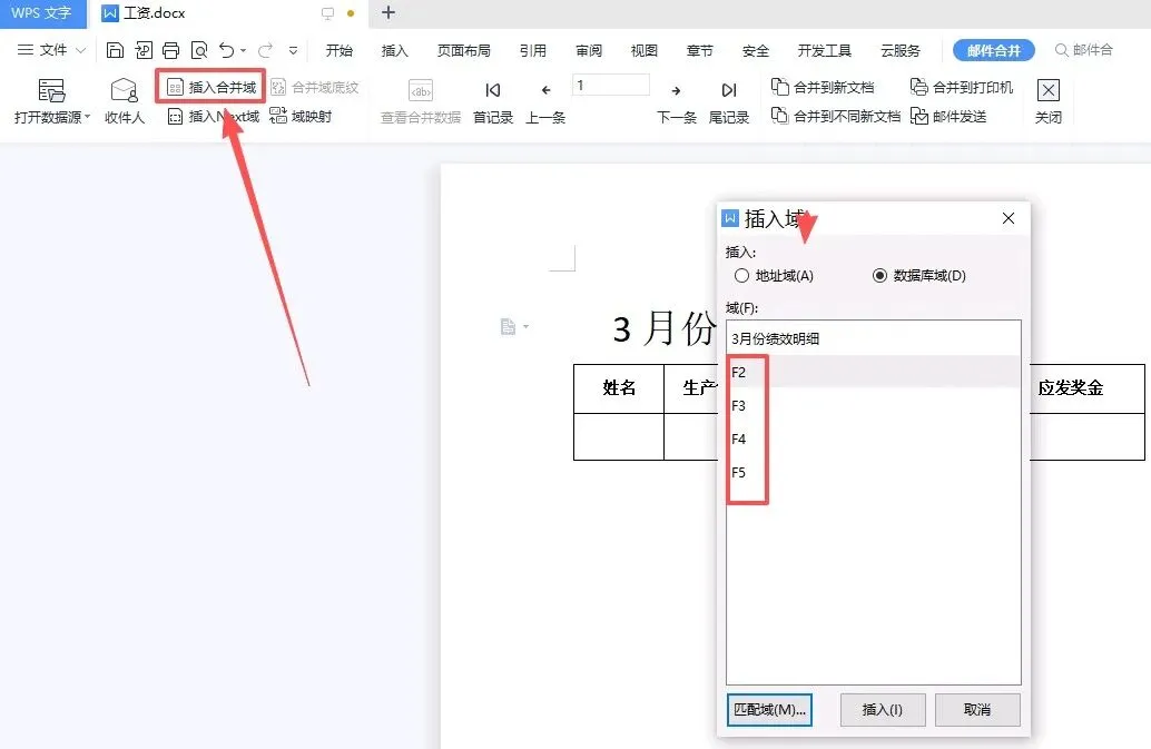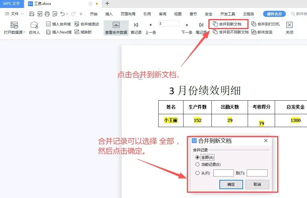 在word中功能搜索框输入邮件合并,依次点击[邮件合并]、[邮件]点击[打开数据源],选择工资信息所在的工作簿,再选择表格中对应的页签。在word中,选中需要填写内容的位置,如姓名栏,点击[插入合并域],弹出插入域窗口,在窗口中选择姓名对应的字段,点击插入;再在word中下一个需要填写内容的位置,如生产件数栏,重复以上插入合并域操作。点击[查看合并数据],此时再点击[下一条],会看到word表格中信息随点击而更新信息,点击[合并到新文档](也可以点击[合并到不同新文档]),可以看到一个弹出窗口,选择[全部],点击确定,即可将表格信息导出到Word中。