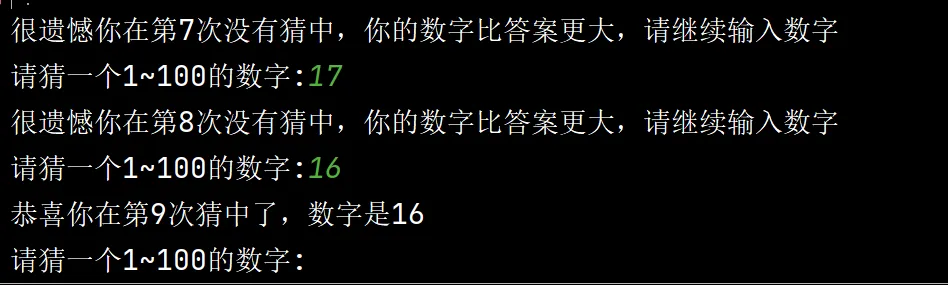 ### 用while循环设置猜数字程序# 生成一个1~100间的随机数import randommynum = random.randint(1,100)# 设置条件mycondition = True# 记录次数i = 0# 用过while循环生成猜数字游戏while mycondition == True:i += 1myinput = input("请猜一个1~100的数字:")if int(myinput) == mynum:print(f"恭喜你在第{i}次猜中了,数字是{mynum}")mycondition == Falseelif int(myinput) > mynum:print(f"很遗憾你在第{i}次没有猜中,你的数字比答案更大,请继续输入数字")elif int(myinput) < mynum:print(f"很遗憾你在第{i}次没有猜中,你的数字比答案更小,请继续输入数字")