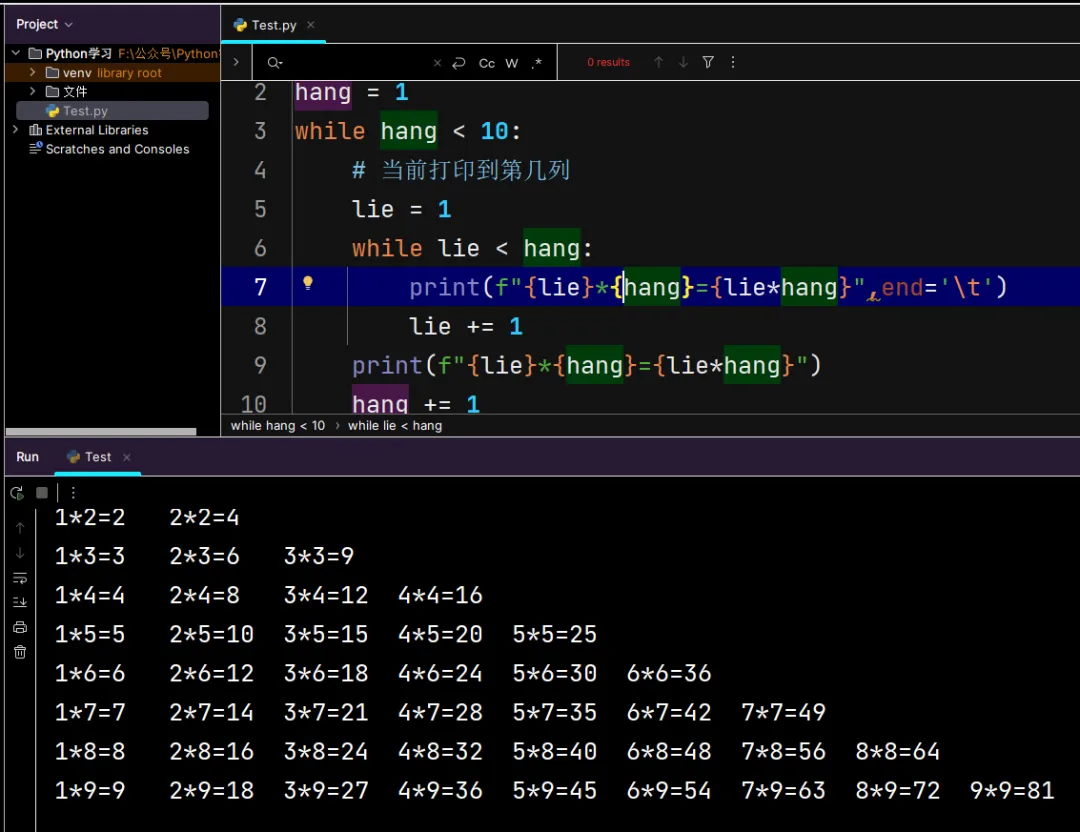 # 当前打印到第几行hang = 1while hang < 10:# 当前打印到第几列lie = 1while lie < hang:print(f"{lie}*{hang}={lie*hang}",end='\t')lie += 1print(f"{lie}*{hang}={lie*hang}")hang += 1