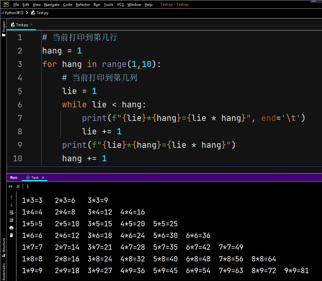 # 当前打印到第几行hang = 1for hang in range(1,10):# 当前打印到第几列lie = 1while lie < hang:print(f"{lie}*{hang}={lie * hang}", end='\t')lie += 1print(f"{lie}*{hang}={lie * hang}")hang += 1