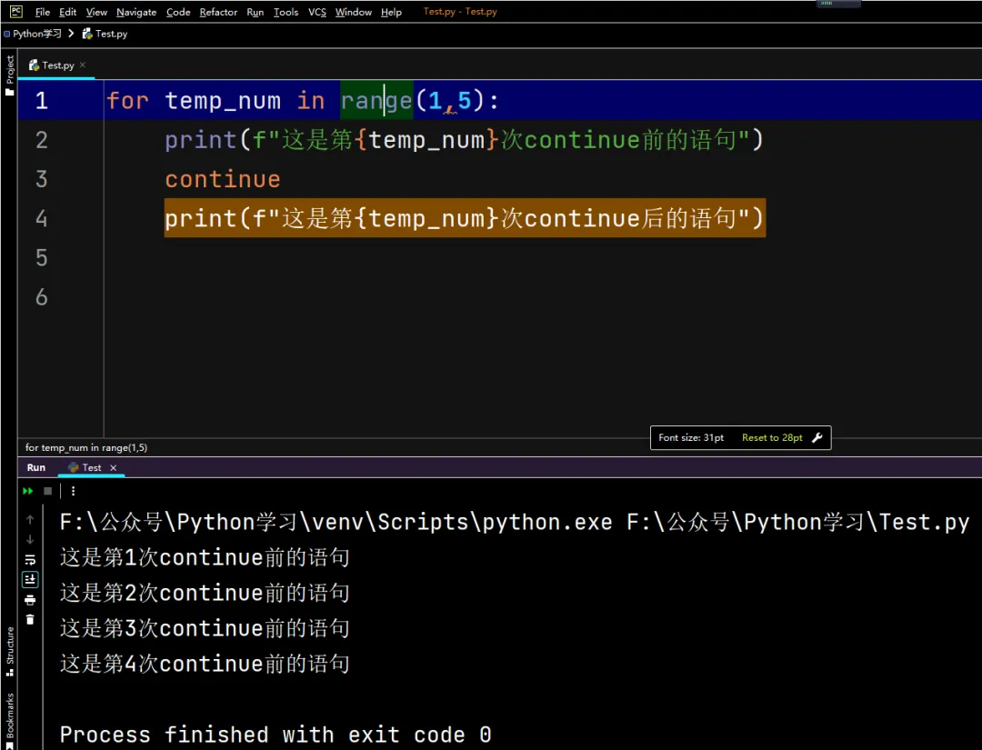 for temp_num in range(1,5):print(f"这是第{temp_num}次continue前的语句")continueprint(f"这是第{temp_num}次continue后的语句")