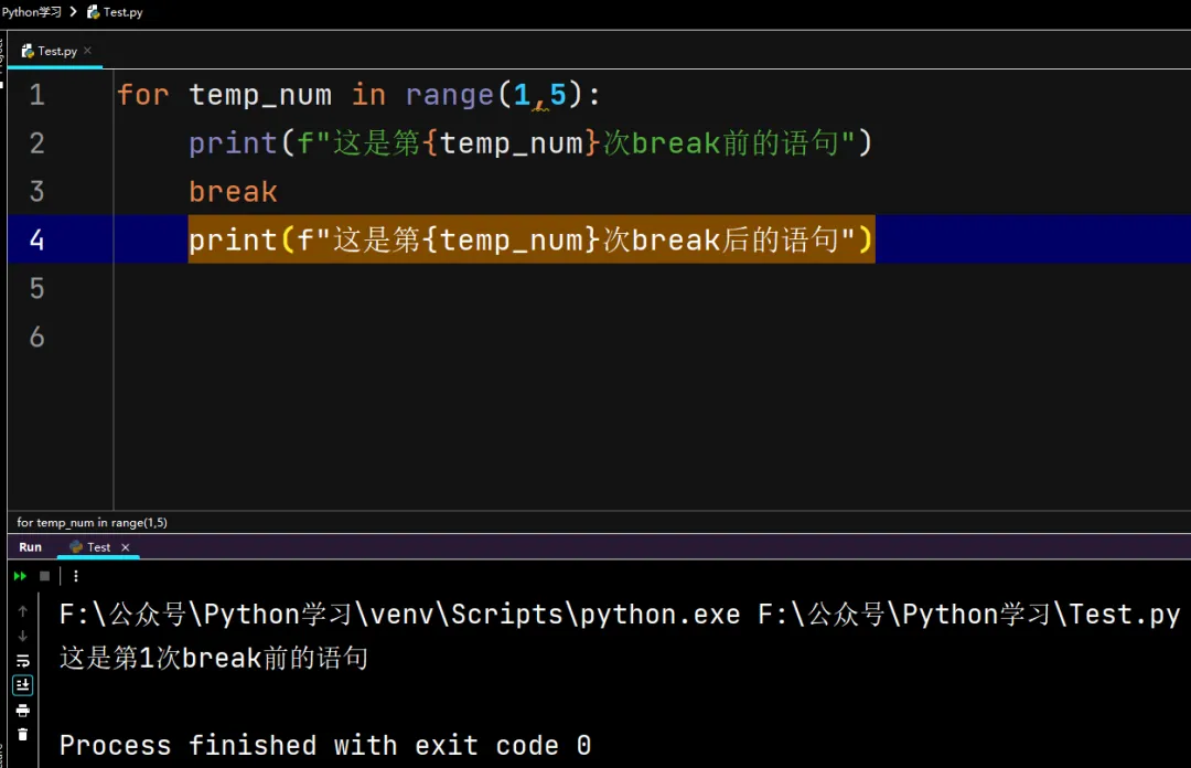 for temp_num in range(1,5):print(f"这是第{temp_num}次break前的语句")breakprint(f"这是第{temp_num}次break后的语句")