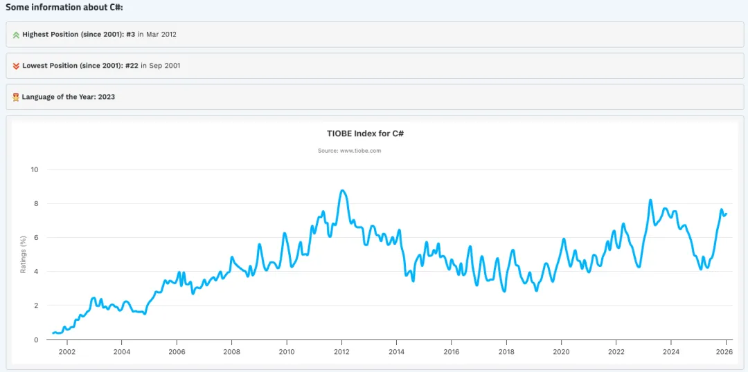 C#能拿下这个年度冠军,绝非一朝一夕之功。算起来,这已经是它在最近三年里第二次获得这个荣誉了。TIOBE的评选标准很客观,就是看年度排名上升幅度,谁进步最快谁就是冠军。从这个维度看,C#确实交出了一份漂亮的成绩单。