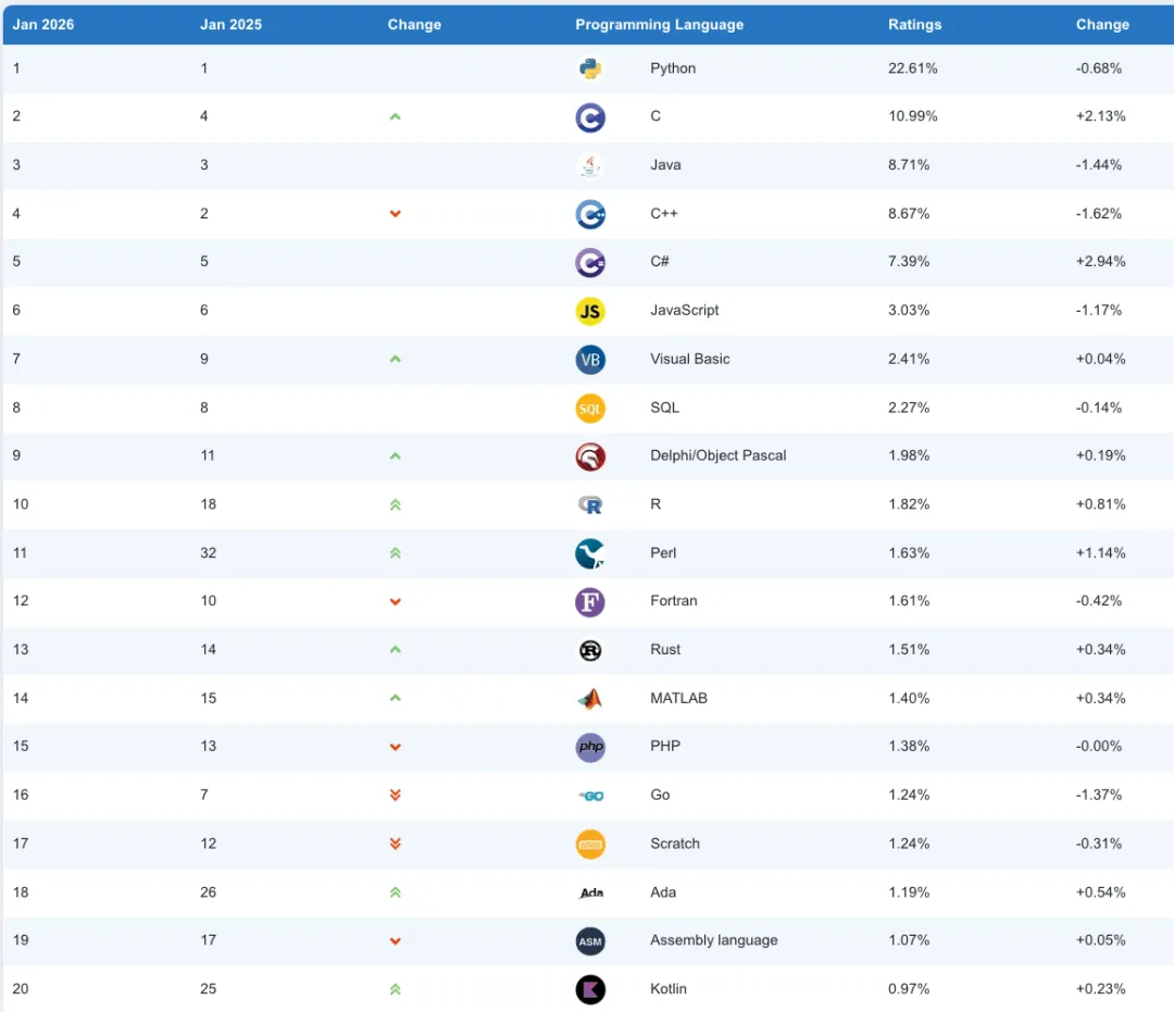 除了C#的夺冠,2025年的TOP10榜单还有不少值得关注的变化。C和C++的排名互换了位置,C语言凭借简洁高效的特点,在嵌入式系统领域继续保持强劲表现。Rust虽然热度很高,创下了历史最好成绩排到第13位,但要在嵌入式市场站稳脚跟还需要时间。