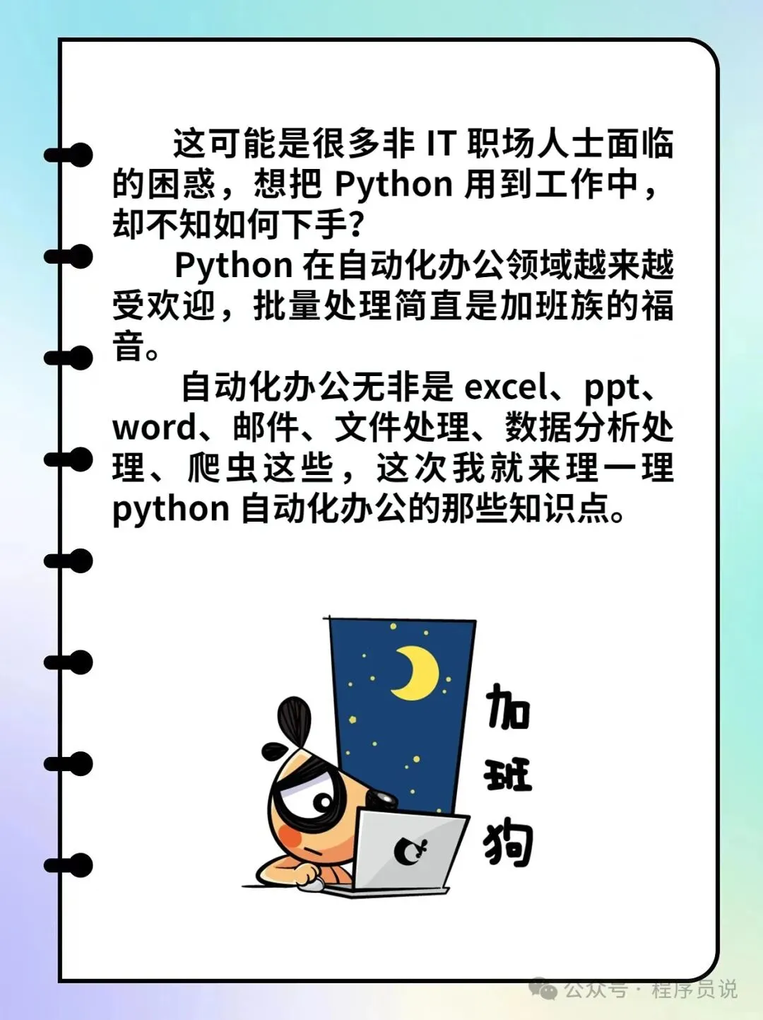 这可能是很多非 IT 职场人士面临的困惑,想把 python 用到工作中,却不知如何下手?python 在自动化办公领域越来越受欢迎,批量处理简直是加班族的福音。