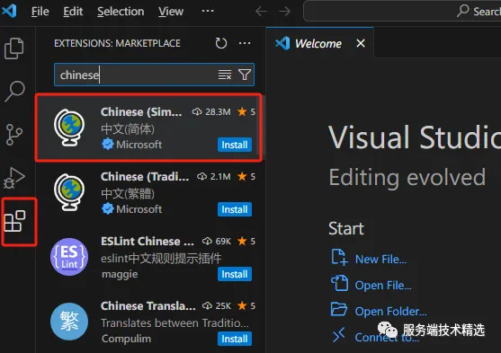 3. 安装中文语言包【可选,习惯英文的同学可以跳过】:启动 VS Code,进入插件 Tab(左侧边栏最后下方的图标),输入 【Chinese】,出现的第一个插件,点击 Install 安装。安装完成后,重启 VS Code 即可生效。