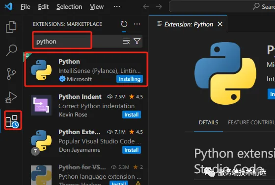 4. 安装 Python 插件:依旧是在插件面板,输入 【Python】,安装列表中的第一个插件。