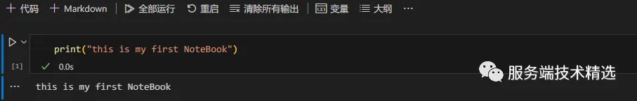 2、添加一个 Cell,通过代码打印“this is my first Notebook”, 并运行。在之后的案例中,我们每介绍一个小阶段,都会通过新建一个 Cell 来编写代码测试我们实验的内容。