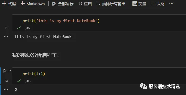 代码 Cell,主要用来编写 Python 代码,每个代码 Cell 都可以单独执行,并且执行结果会展示在 Cell 的下方。