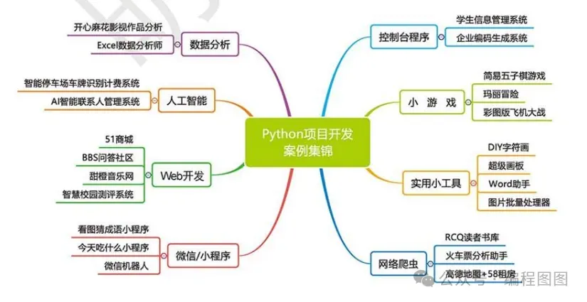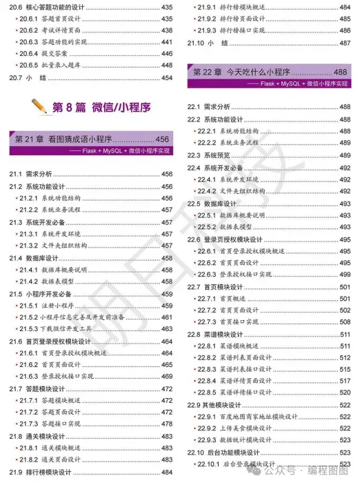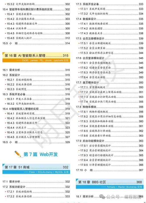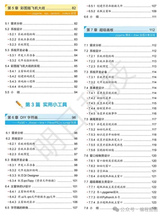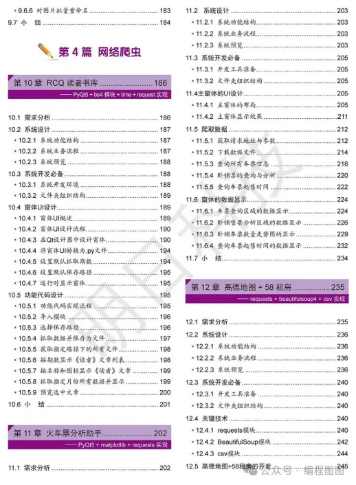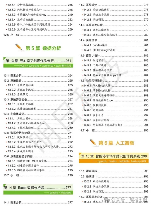 全书共分 8 篇:控制台程序、小游戏、实用小工具、网络爬虫、数据分析、人工智能、Web 网站和微信 / 小程序