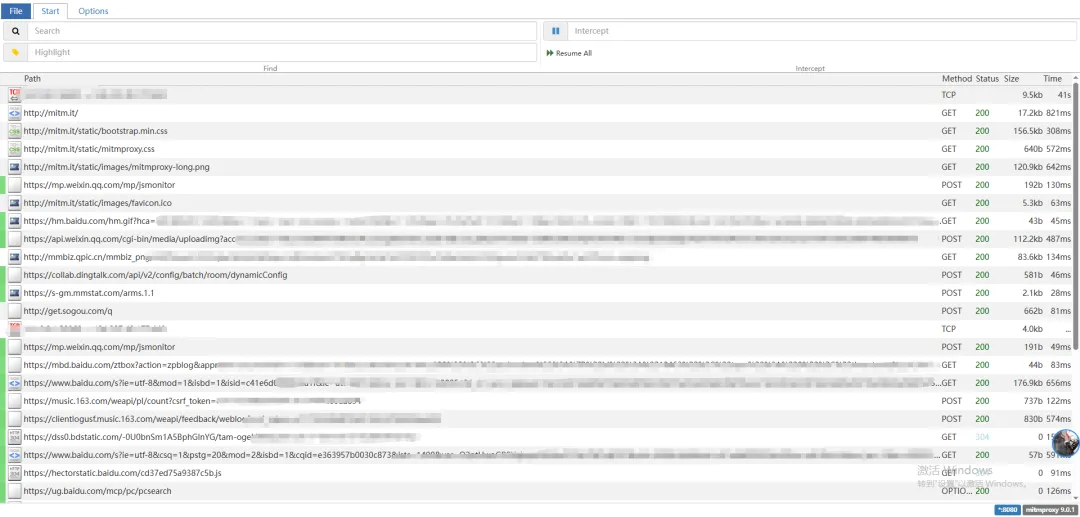 安装完证书,我们再来查看 mitmweb 的网页,你会发现有不少接口,说明你已经成功运行: