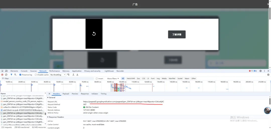可以看到产生广告的目标链接有 https://pagead2.googlesyndication.com(谷歌广告相关链接非常多,不单单只有这一个)。