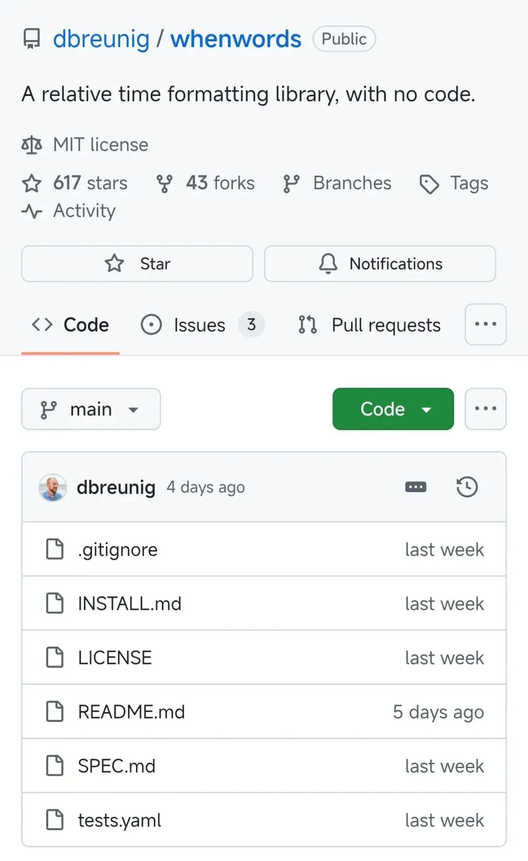 最近在 GitHub 上看到一个叫 whenwords (https://github.com/dbreunig/whenwords) 的仓库,没有源码、没有实现,只有一份接口规范和一组测试用例。最初的反应是:what??? 又是哪个行为艺术么这是?