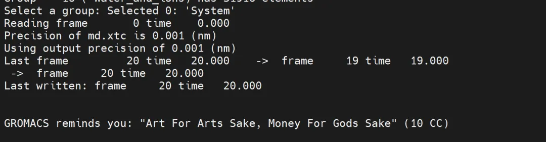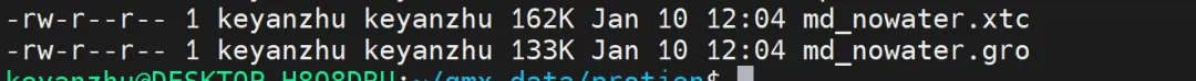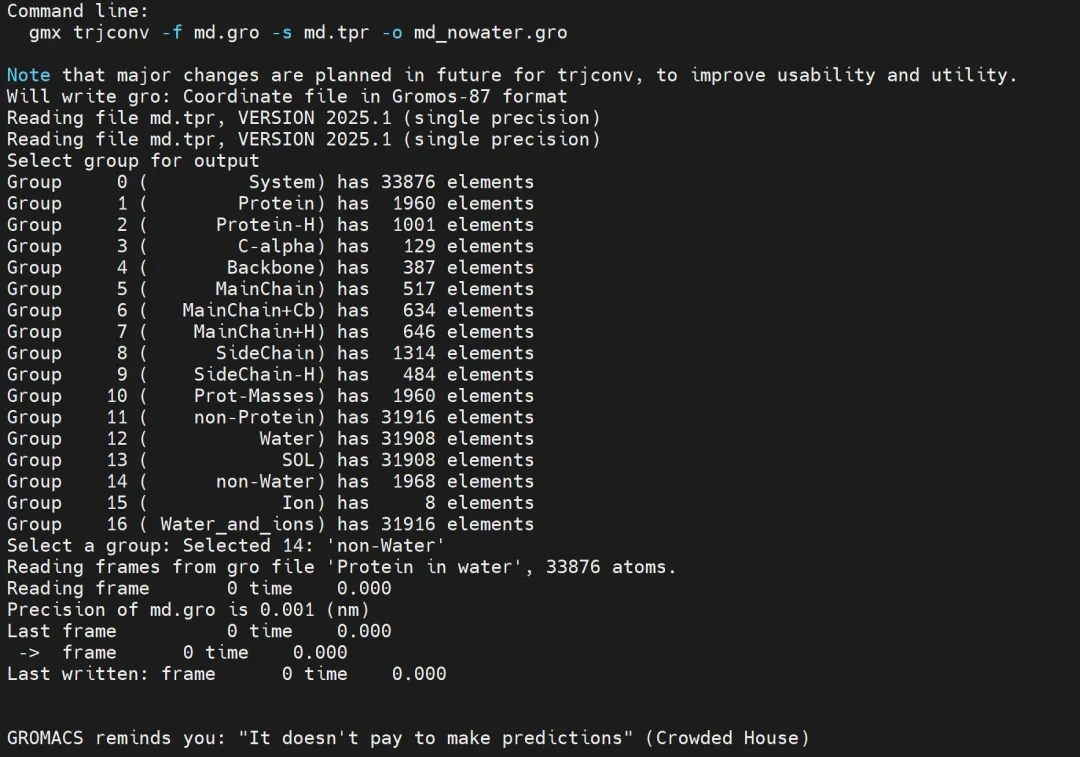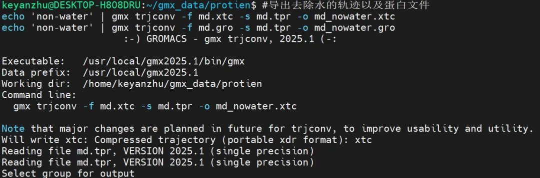 #导出去除水的轨迹以及蛋白文件echo 'non-water' | gmx trjconv -f md.xtc -s md.tpr -o md_nowater.xtcecho 'non-water' | gmx trjconv -f md.gro -s md.tpr -o md_nowater.gro