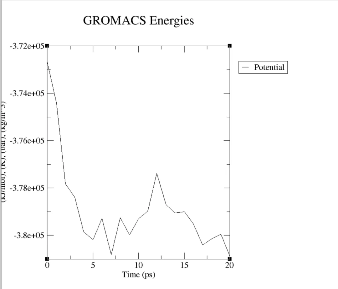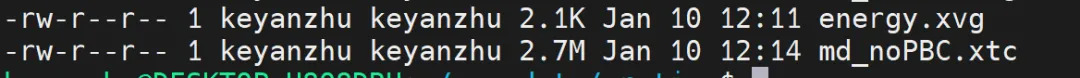 #查看能量温度压力密度变化等echo -e "Potential\nTemperature\nPressure\nDensity\n" | gmx energy -f md.edrecho -e "Protein\nSystem" | gmx trjconv -s md.tpr -f md.xtc -o md_noPBC.xtc -pbc mol -center