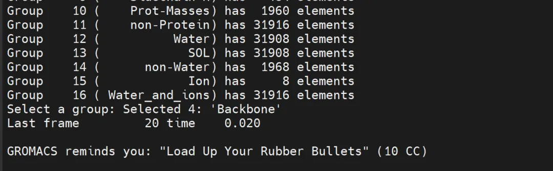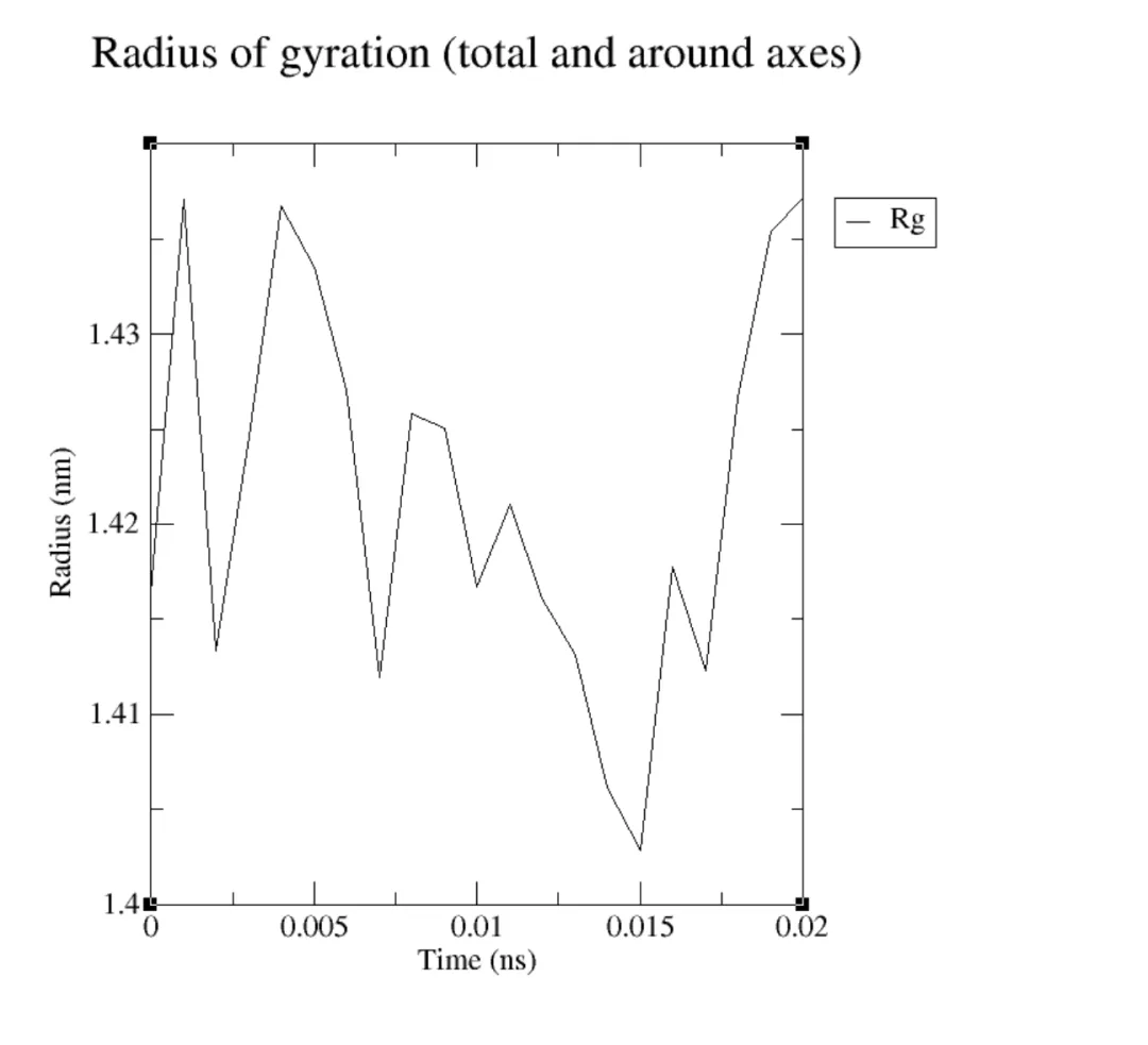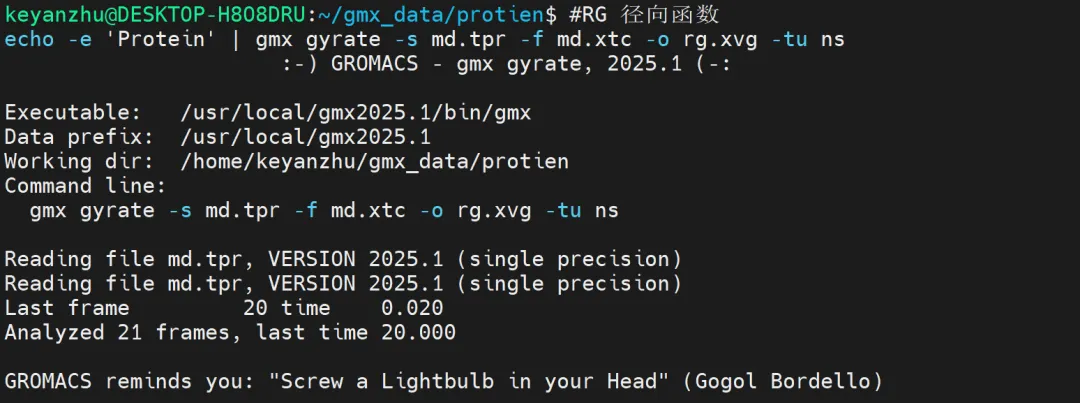 #RG 径向函数echo -e 'Protein' | gmx gyrate -s md.tpr -f md.xtc -o rg.xvg -tu ns