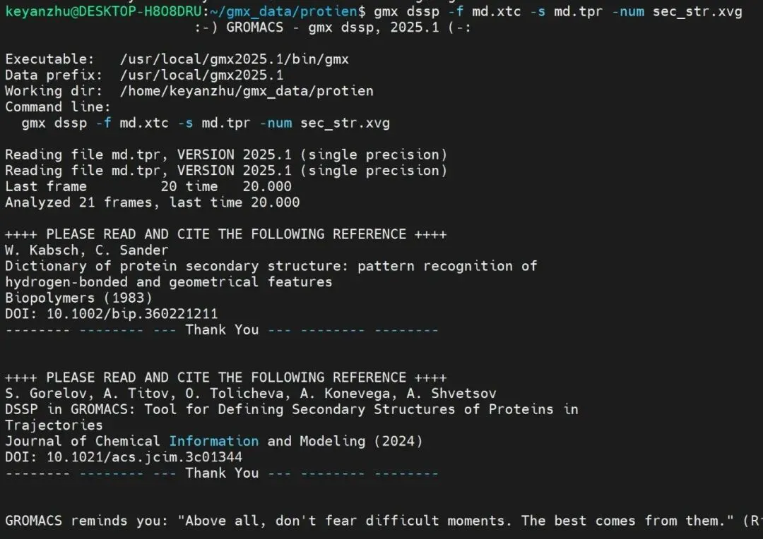 #second structionecho -e "Protein" | gmx dssp -f md.xtc -s md.tpr -num sec_str.xvg