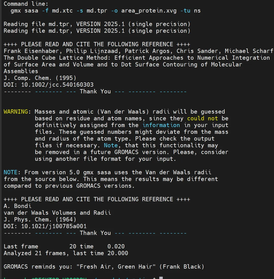 #SASA xmgrace -nxy area.xvgecho "protein" | gmx sasa -f md.xtc -s md.tpr -o sasa.xvg -tu ns