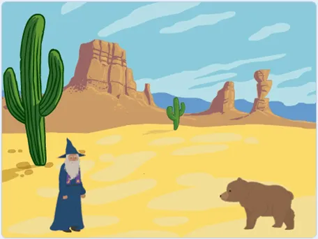 (2)点击绿旗,背景为Desert,两个角色的位置、方向和造型如下图所示;