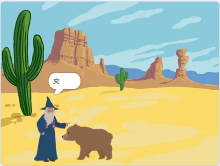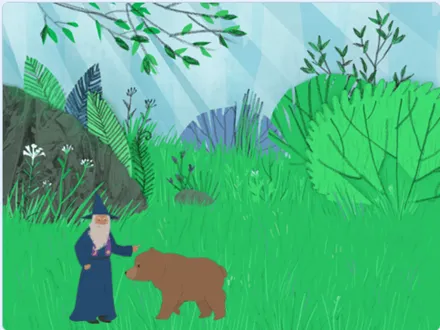 (4)当熊走到魔法师面前后,魔法师切换成"wizard-c"造型,说"变"2秒,背景切换成Forest。