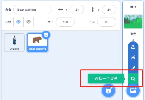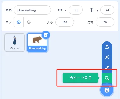 (1)删除角色小猫,添加角色Wizard,Bear-walking;