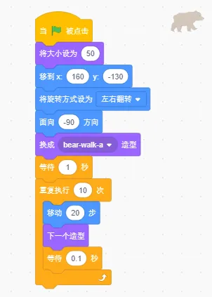 (3)等待1秒后,熊朝着魔法师走去,一边走一边切换造型;