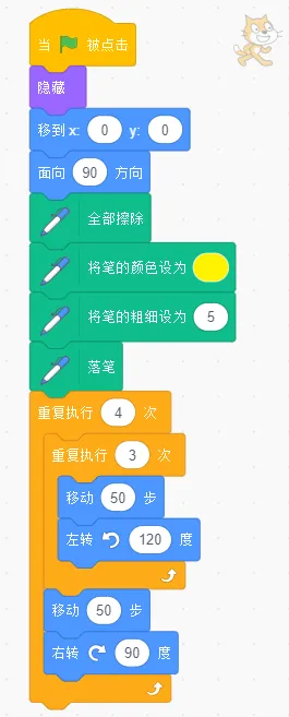 (2)点击绿旗,绘制如下图所示图形,三角形的边长为50。