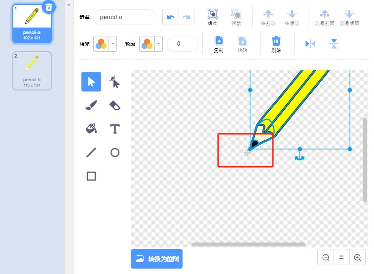 (1)删除小猫角色,添加角色Pencil,中心点设置在笔尖位置;