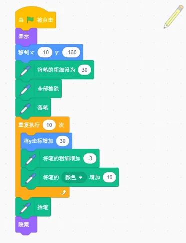 (1)隐藏角色小猫,设置画笔初始位置为(0,0),画笔颜色为黄色,画笔的粗细为5;