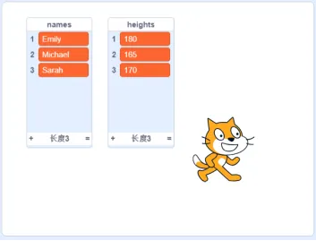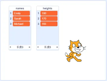 默认小猫角色和白色背景。有两个列表,第一个列表“names”存储名字,第二个列表“heights”存储这组名字对应的身高,这些身高由互不相同的正整数组成。