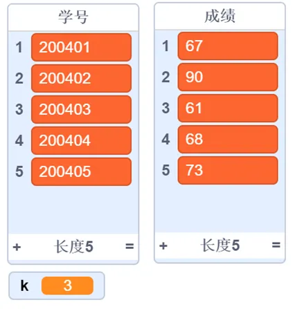 输入:{'学号': ['200401', '200402', '200403', '200404', '200405', '200406', '200407', '200408', '200409', '200410', '200411']},{'成绩': [54, 65, 41, 53, 46, 40, 80, 71, 91, 73, 70]},{'k': 7}输出:{'result': '200401 54'}青少年编程竞赛交流