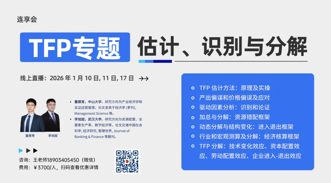 🍓 课程推荐:连享会-TFP专题:估计、识别与分解嘉宾:董展育 (中山大学);李旭超 (武汉大学)时间:2026 年 1 月 10, 11, 17 日咨询:王老师 18903405450(微信)