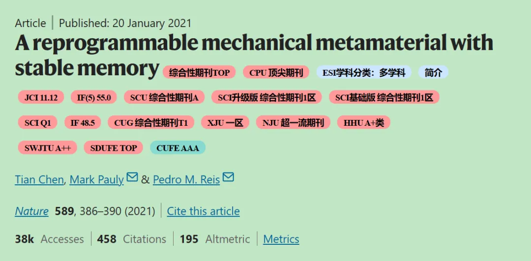 英文题目:A reprogrammable mechanical metamaterial with stable memory