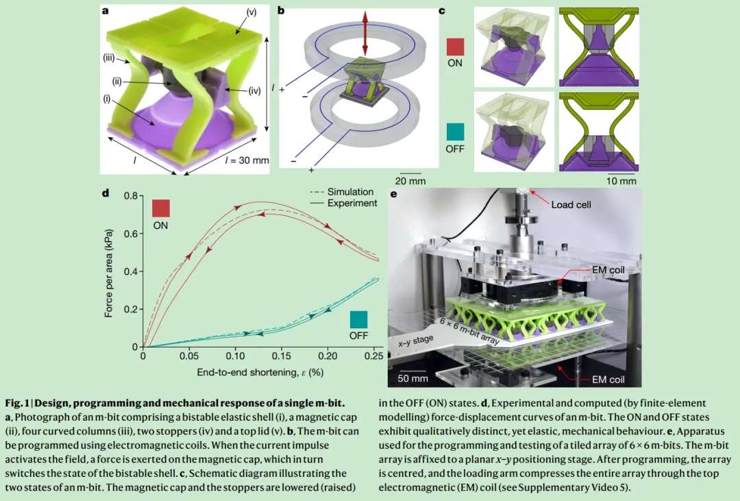 • 每个 m-bit 为立方体单元,由双稳态弹性锥壳、磁性帽、弧形柱、限位器和顶盖组成。