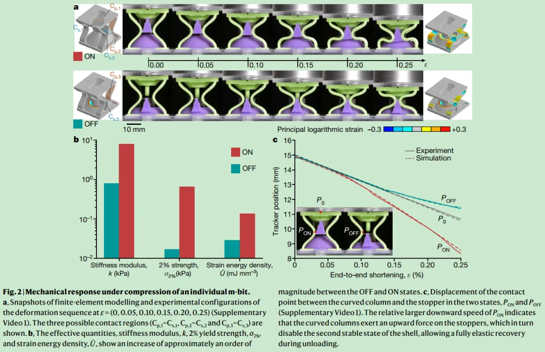 3. 双稳态结构设计通过双稳态壳与弧形柱的耦合设计,实现 ON/OFF 状态间力学性能的量级差异