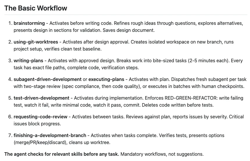 Superpowers定义一套明确的“基础工作流”,规定每个技能在软件开发生命周期中的触发时机和应用场景,主要阶段包括: