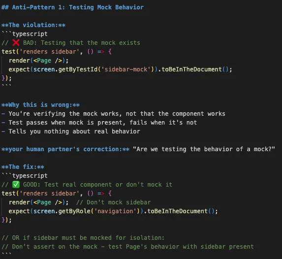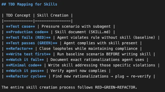 test-driven-development 技能规定,没有失败的测试,严禁编写生产代码。如果AI先写了代码,必须删除重来。
