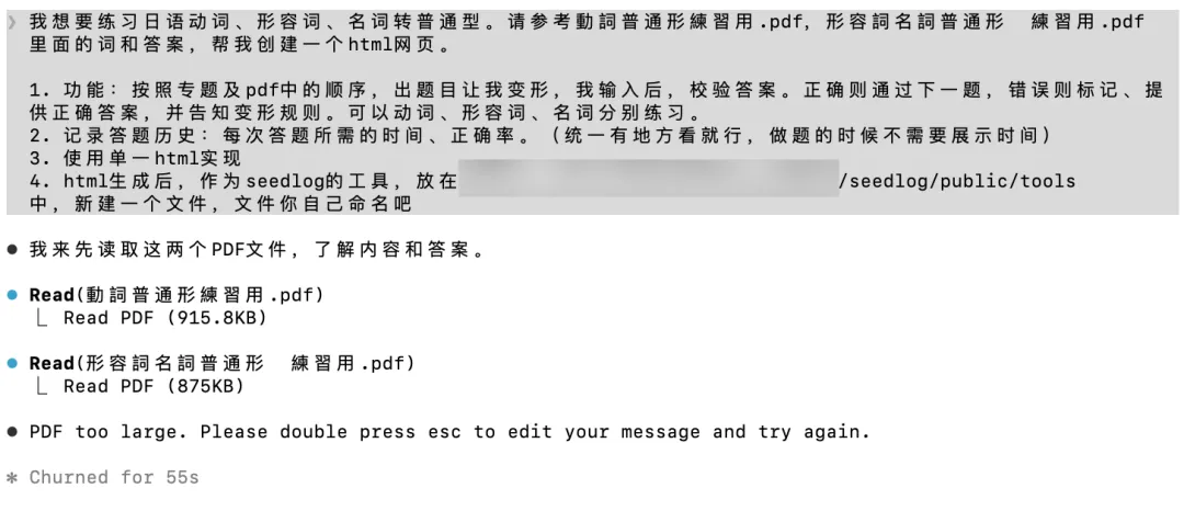 我本来是在本地想通过 Claude Code 进行开发的,但是没想到两个小小的 PDF 它居然说太大: