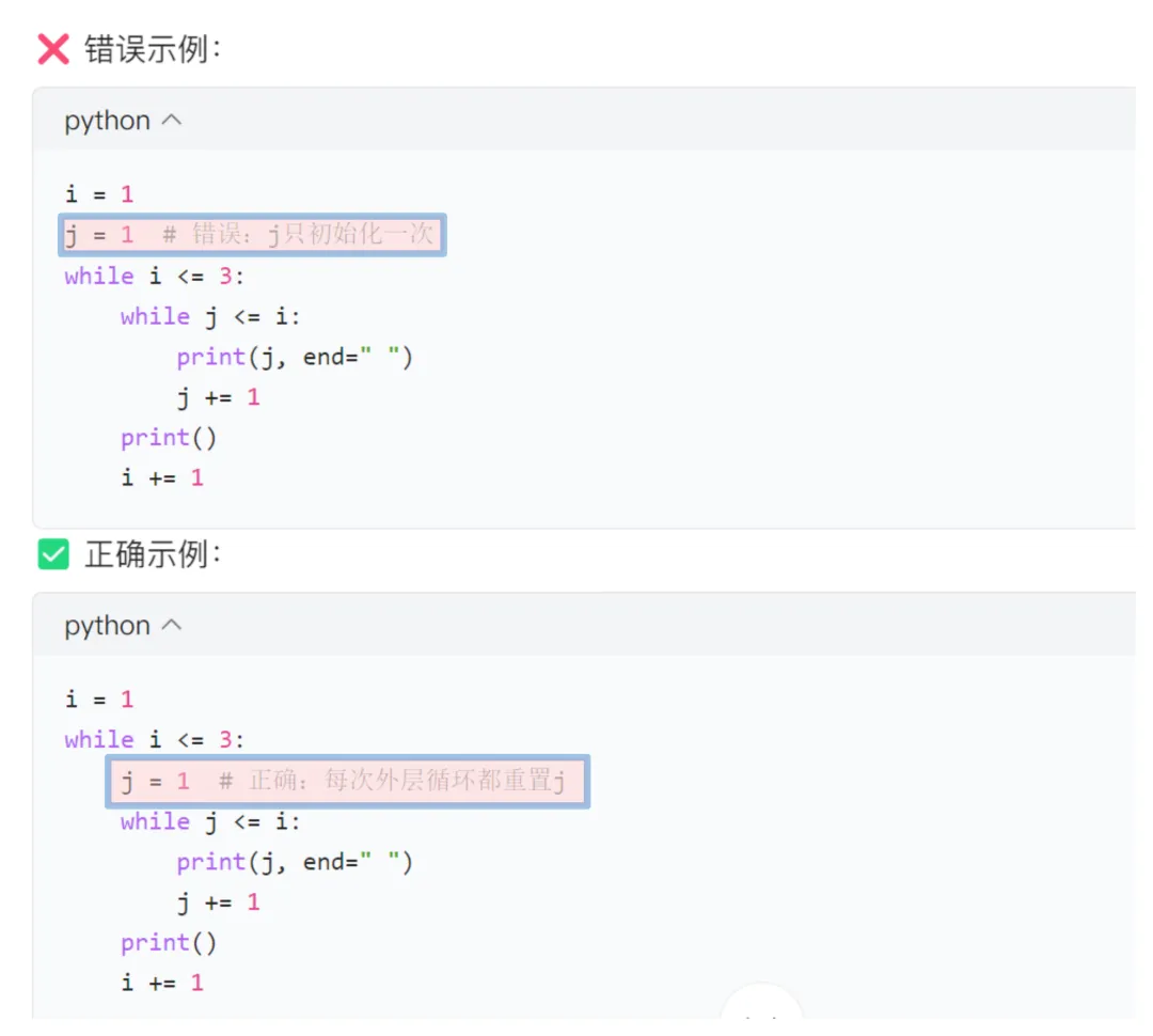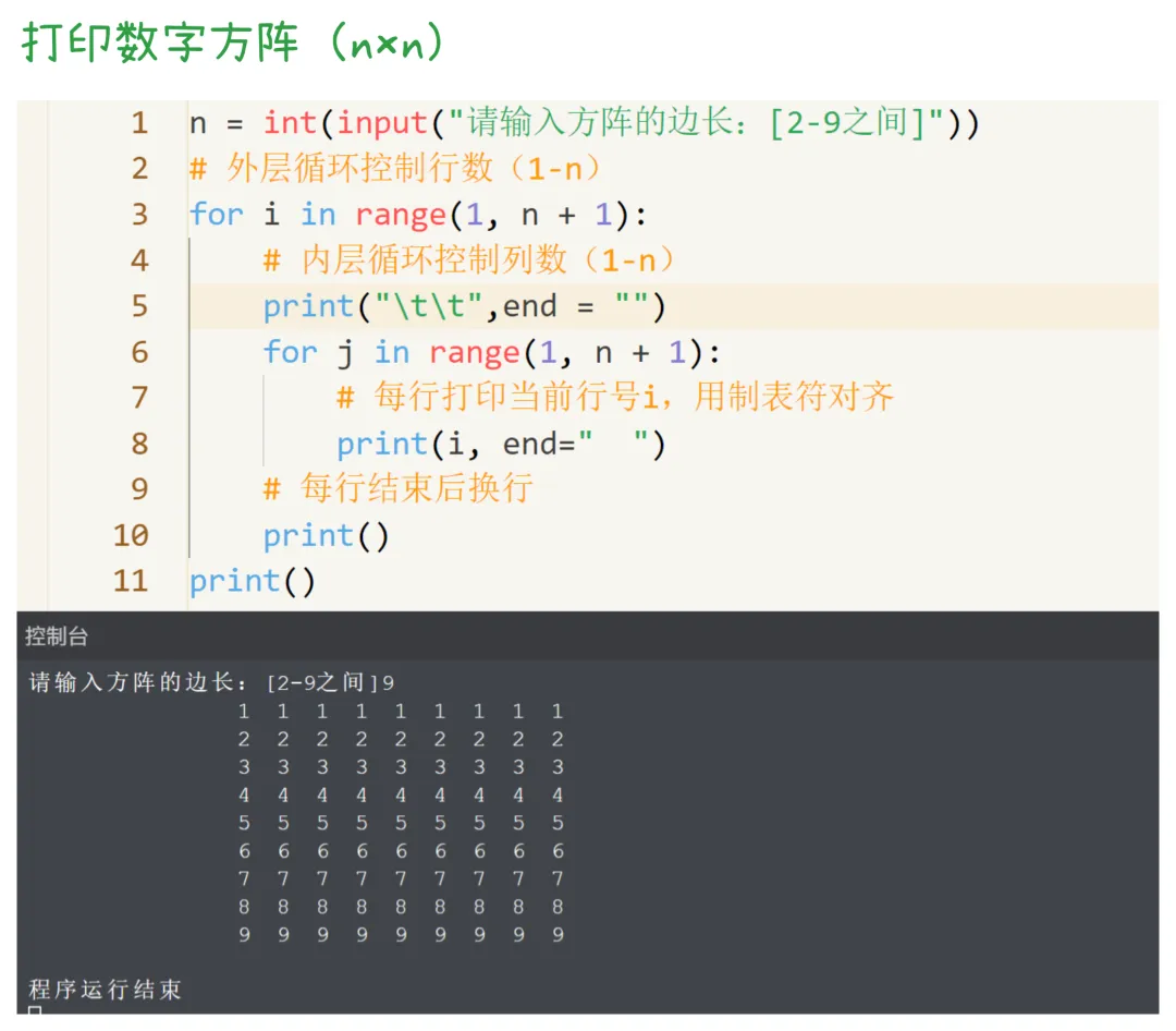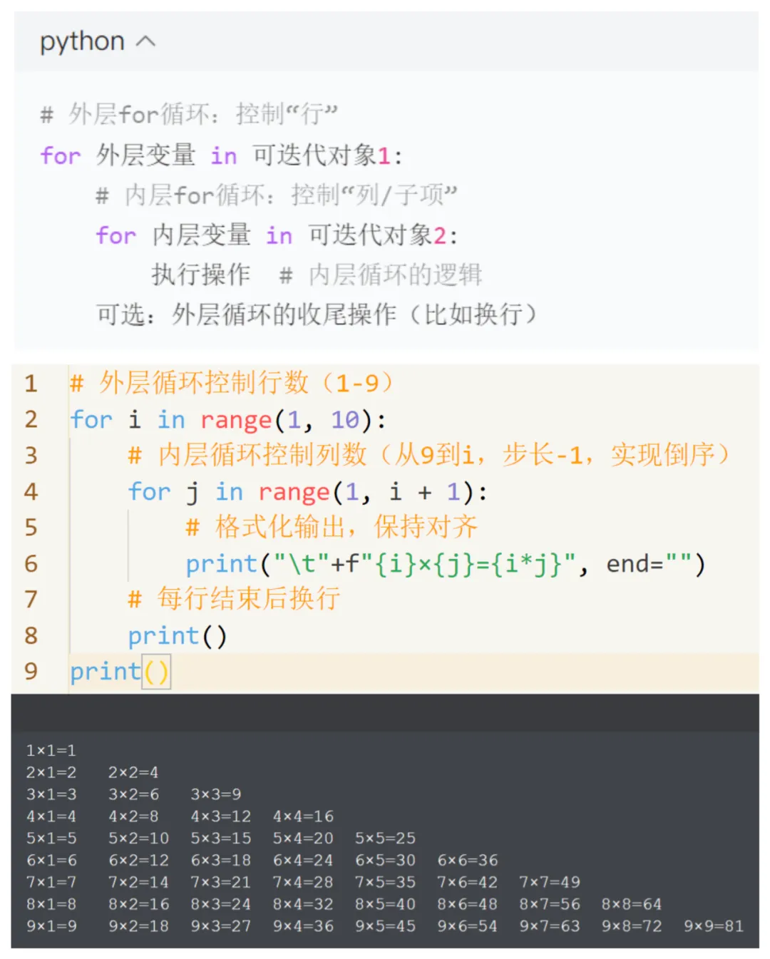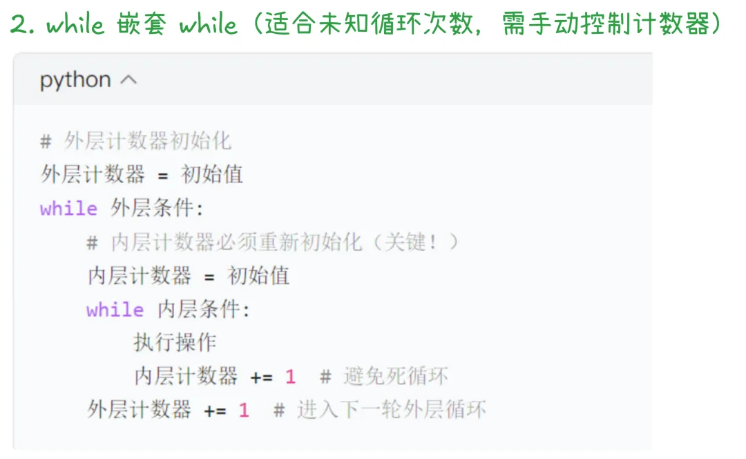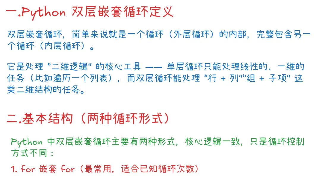 # 外层for循环:控制“行”for 外层变量 in 可迭代对象1: # 内层for循环:控制“列/子项” for 内层变量 in 可迭代对象2: 执行操作 # 内层循环的逻辑 可选:外层循环的收尾操作(比如换行)