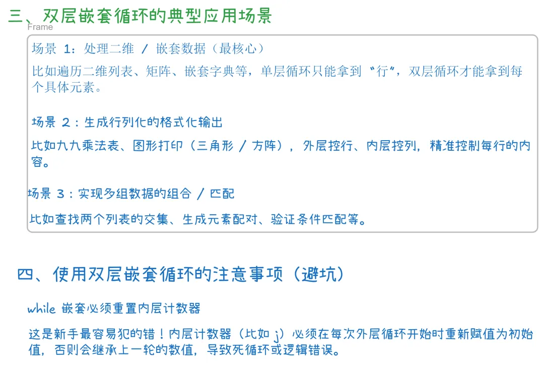 双层嵌套循环,简单来说就是一个循环(外层循环)的内部,完整包含另一个循环(内层循环)。它是处理 “二维逻辑” 的核心工具 —— 单层循环只能处理线性的、一维的任务(比如遍历一个列表),而双层循环能处理 “行 + 列”“组 + 子项” 这类二维结构的任务。