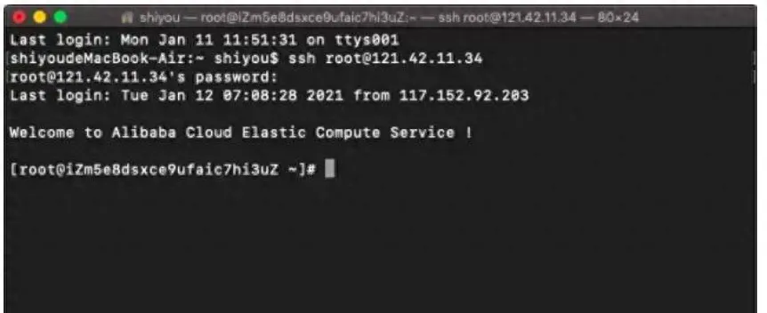 通过执行 ssh root@121.42.11.34 命令,然后输入服务器连接密码就可以顺利登录远程服务器。从现在开始我们就可以在本地电脑操作远程服务器。