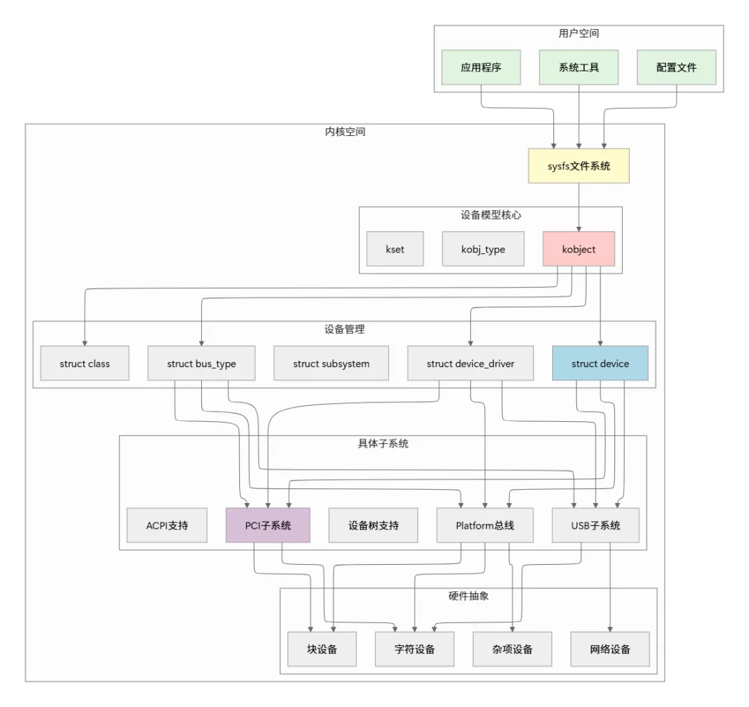 device包含kobject, driver包含kobjectclass和bus负责创建和销毁设备节点Linux设备驱动模型是一个精心设计的复杂系统, 它通过分层抽象和统一管理, 解决了设备管理的根本问题. 从最简单的字符设备到最复杂的PCIe设备, 都遵循着相同的架构模式