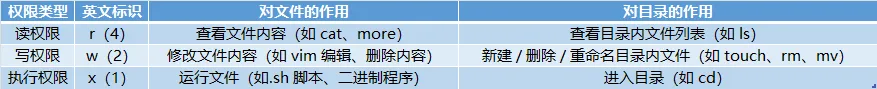权限类型分 3 种,分别对应 “读、写、执行”,但对 “文件” 和 “目录” 的含义完全不同,这是新手最容易混淆的点,一定要记牢: