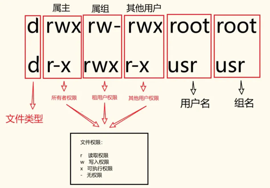 每三位对应一个权限对象,分别由`r(读)、w(写)、x(执行)、-(无权限)`组成: