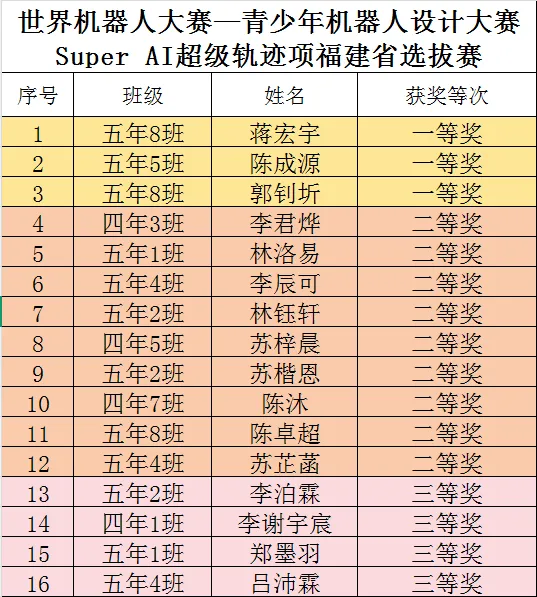 祝贺我校机器人编程社团在被誉为机器人界“奥林匹克”的世界机器人大赛—青少年机器人设计大赛Super AI超级轨迹项福建省选拔赛中斩获3个一等奖、9个二等奖、4个三等奖的亮眼战绩。