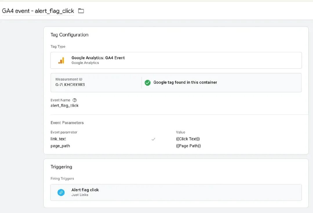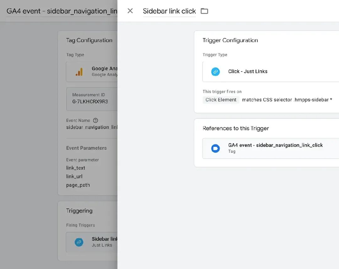 我在 GTM 中为包含该导航菜单的 CSS 类设置了专属的自定义标签与触发条件,用于追踪菜单内的链接点击行为。该标签会将被点击链接的文本内容和 URL 地址同步至 GA4,方便我们统计出点击量最高的功能链接。