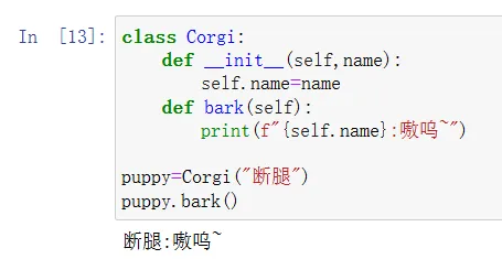 Class用来定义类,Corgi("短腿")用来实例类,实例后即可使用类描述的方法。