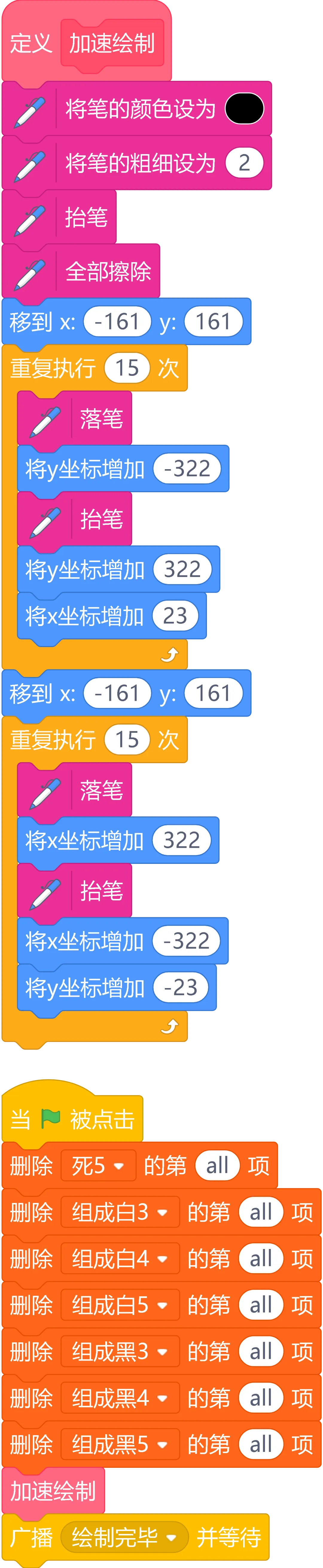 游戏初始化:舞台发送"游戏开始"广播,绘制棋盘角色绘制棋盘,其他角色做好准备
