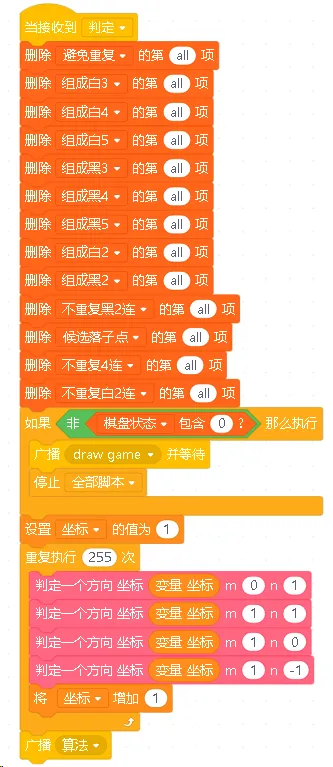 当接收到"判定"广播时 清空各种棋型记录列表 重复255次(检查棋盘上的每个位置) 调用检测函数(从四个方向检测) 更新棋型记录 广播"广播消息"(通知AI可以开始计算)自制积木:检测函数 分析当前位置的上下左右四个方向 判断是否形成了黑2、黑3、黑4、黑5等棋型 判断是否形成了白2、白3、白4、白5等棋型 将结果保存到对应的列表中