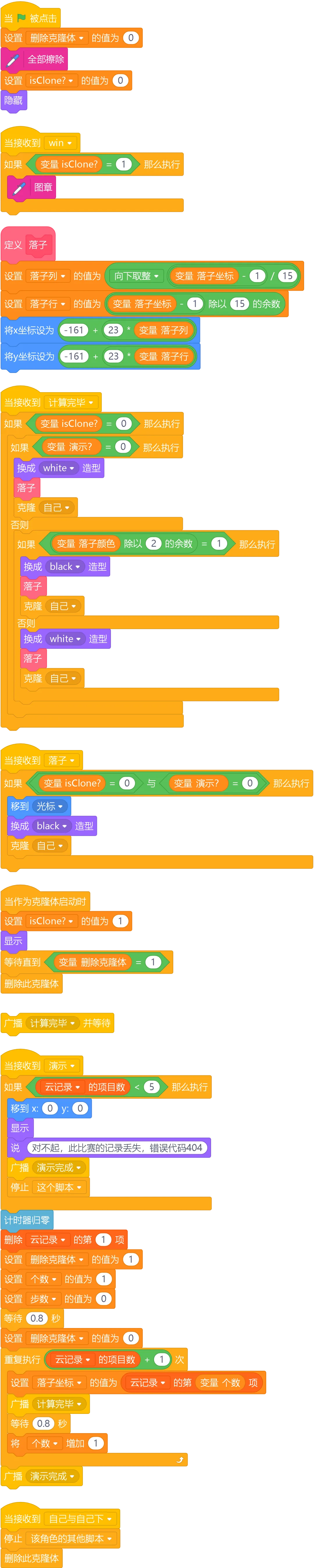 当接收到"计算完毕"广播时 如果是本体且在游戏模式下 根据落子颜色切换造型 调用设置位置的自制积木 克隆自己当作为克隆体启动时 设置为克隆体状态 显示 等待一会儿 删除此克隆体(只留下印记)自制积木:设置位置 将落子坐标转换为行和列 计算出对应的X和Y坐标 移动到目标位置